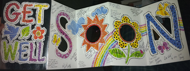 The biggest thank you goes to my girlfriend, the wonderful @MissBrittz, who knew how to take care of me through the worst parts, made the long drive from Syracuse several times to visit, and helped in all the little ways. She even designed a homemade card and sent it to my closest friends. Inside were address labels, stamps, and instructions for recipients to add sentiments, get other people to sign it, and send it to the next person on the list, eventually getting to me. Coolest thing anyone’s ever made for me.