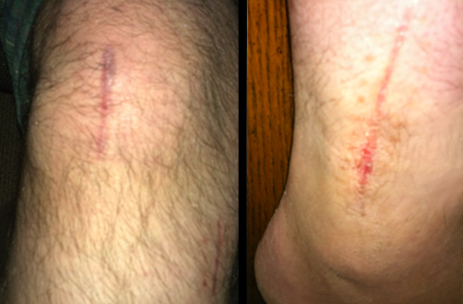 Two of the new scars on my right leg - pictured left is my knee (where they put the metal rod in), and pictured right is my ankle (where they put a plate in).